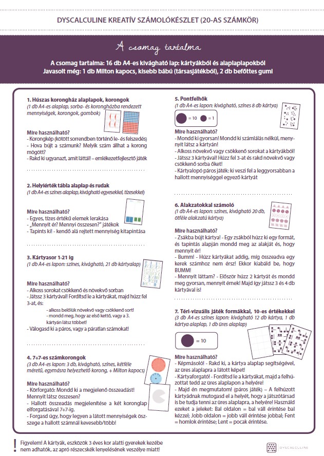 A kipróbált, és a Dyscalculine Programban használt eszközök közül a csomagokba különbözőféle számtáblák, mátrixok, alaplapok, számolókockák, számhajtogató lapok, számharmonikák, műveletpuzzle-ök, számolós memória kártyák stb. kerültek. Olyan táblák, amelyek segítik az egyes számkörökben a tájékozódás fejlődését, az összefüggések felismerését, a matematikai szabályok vizuális rögzítését. Alkalmasak a számfogalom és a műveleti fogalom stabilizálására.