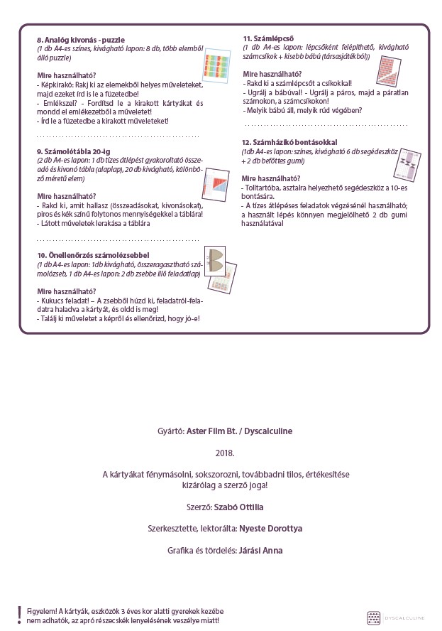 A pedagógus továbbképzéseinken igényként fogalmazódtak meg olyan segédeszközkészletek, amelyek a diszkalkulia terápiában – más-más számkörökben, más-más életkorú tanulókkal hasznosíthatók. Így összeállítottunk olyan Kreatív Számolókészletet, amelyet csak ki kell vágni, össze kell ragasztani, vagy meghajtogatni, applikálni, és a terápia vagy az otthoni gyakorlás kellékei lehetnek.